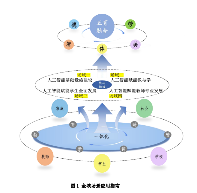 《指南》以“五育并举、融合育人”为根本,创新性提出“五育六助”核心架构。该架构以“场域—场景—典型应用”为实施路径,系统覆盖助教、助学、助研、助管、助评、助育六大核心场景,致力于构建全链条融通、全场景覆盖的一体化应用体系: