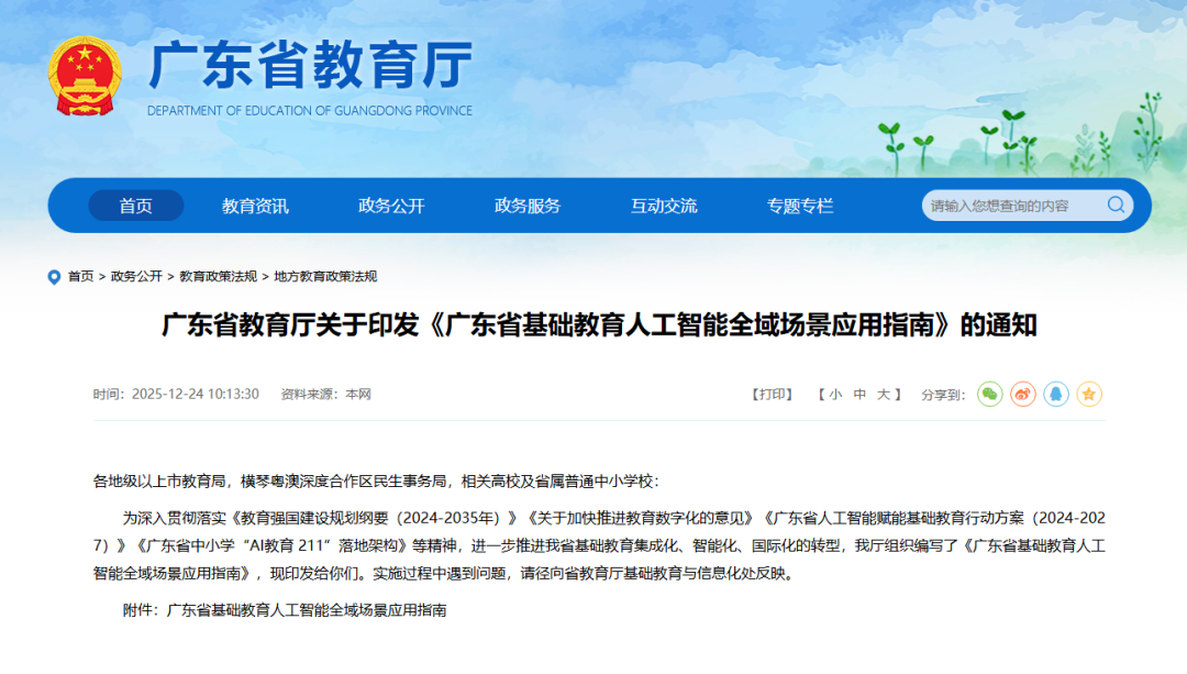 12月24日,广东省教育厅印发《广东省基础教育人工智能全域场景应用指南》,旨在以人工智能全域应用为抓手,系统推动全省基础教育向集成化、智能化与国际化转型。