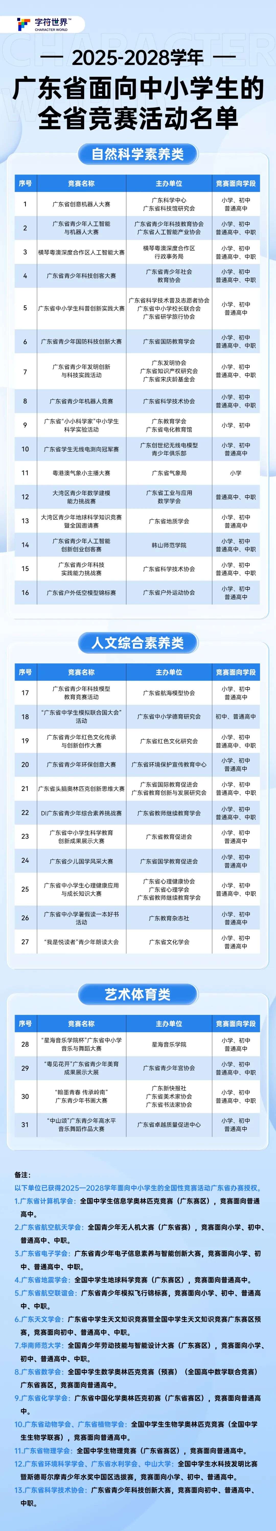 重磅!广东省2025-2028学年面向中小学生的全省竞赛活动名单