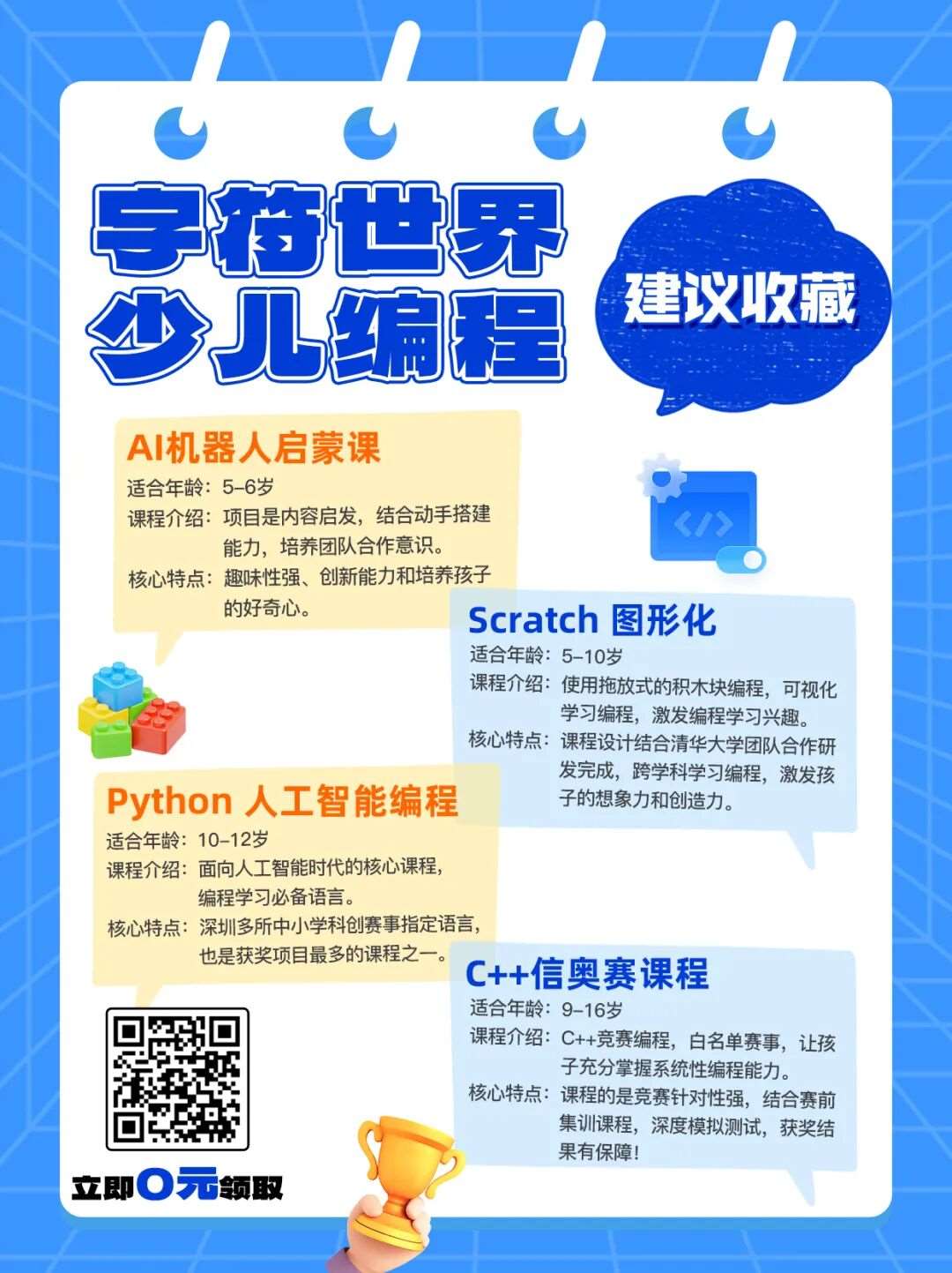 在字符世界,每一份热爱都值得被守护,每一个梦想都有机会绽放。我们见证着每一位学员的成长与蜕变,也愿为更多心怀热爱的少年搭建平台,用专业的教学、用心的陪伴,助力他们在编程的世界里逐光而行,奔赴属于自己的精彩未来!