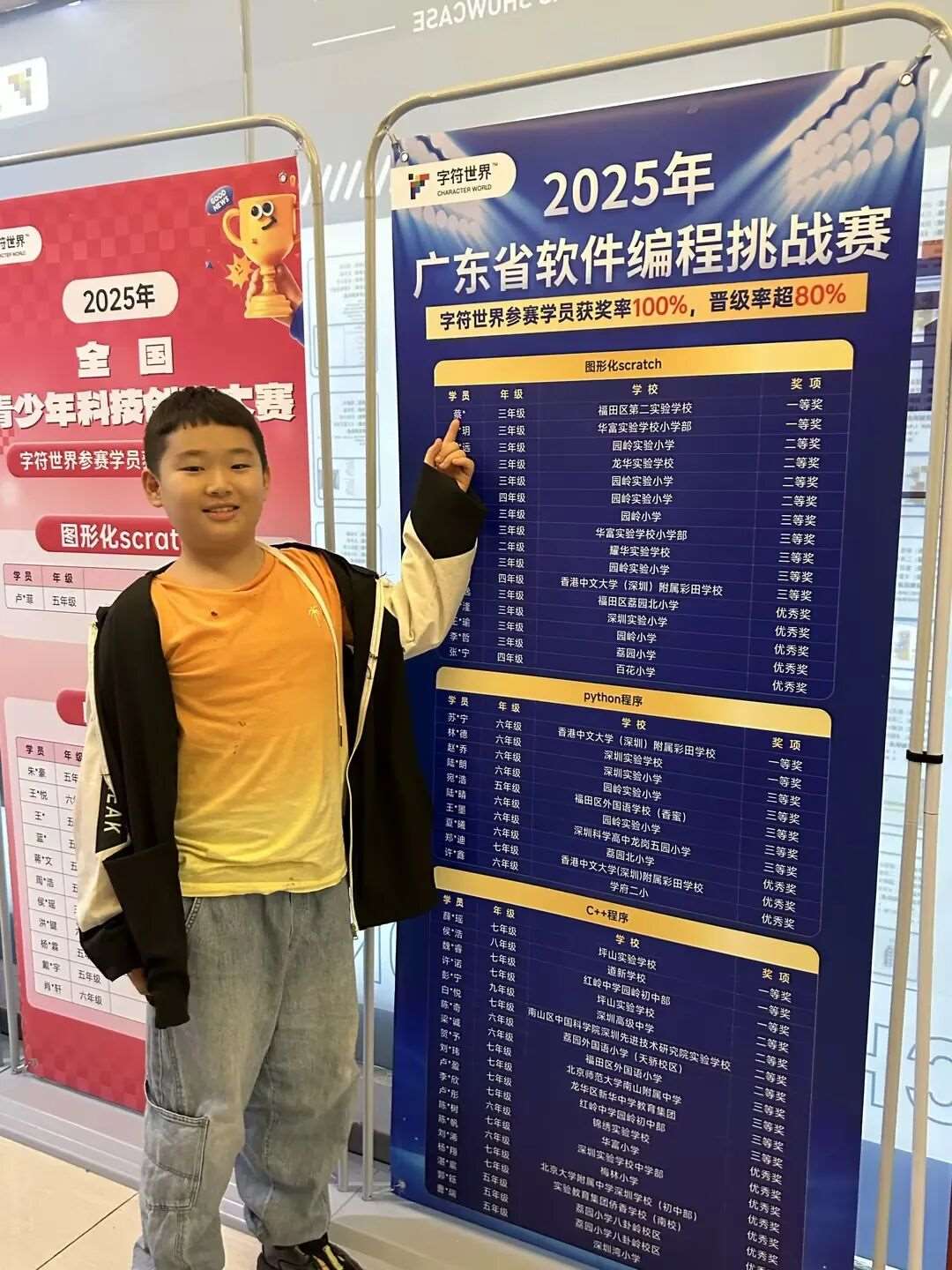 在字符世界的课堂上,总有这样一位身影:他专注凝视屏幕,指尖在键盘上灵活跳跃,时而蹙眉思考,时而主动俯身帮助同学,用认真与热忱诠释着对编程的热爱。他就是来自福田第二实验小学四年级的蔡同学,一位在字符世界深耕2.5年,斩获多项大奖的优秀学员。