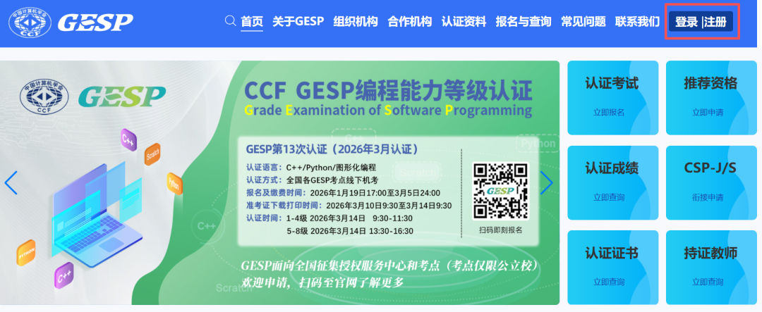 在电脑上使用Google Chrome浏览器/Microsoft Edge浏览器/Firefox浏览器进入GESP官网 (https://gesp.ccf.org.cn) ,参加过GESP认证的考生可直接点击【登录】;未参加过GESP的考生需先点击【注册】完成新用户注册→点击【登录】。