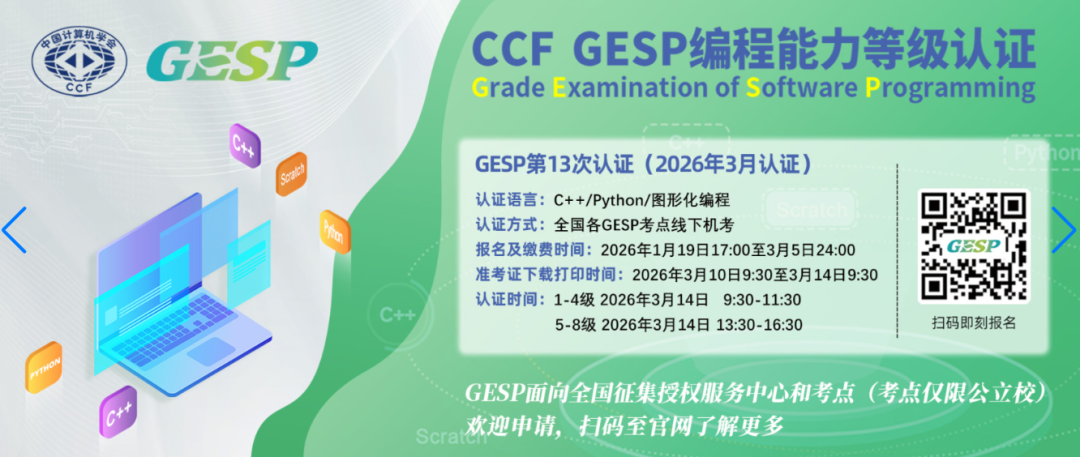 第13次GESP认证将于2026年3月14日举行。其中,1-4级认证安排在上午9:30至11:30,5-8级认证安排在下午13:30至16:30。报名通道已于1月19日17:00正式开启,考生可登录GESP官网报名。考试形式为全国各GESP考点统一上机考试,语言包括C++、Python及图形化编程,各语言分级设置如上,欢迎广大编程学习者积极报名参与。
